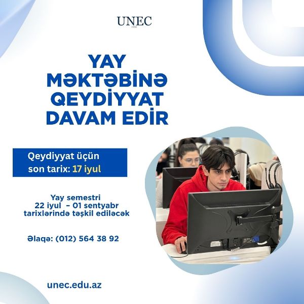 UNEC-də cari tədris ilinin Yay semestri 22 iyul 2025 – 01 sentyabr 2025 tarixlərində təşkil ediləcək.