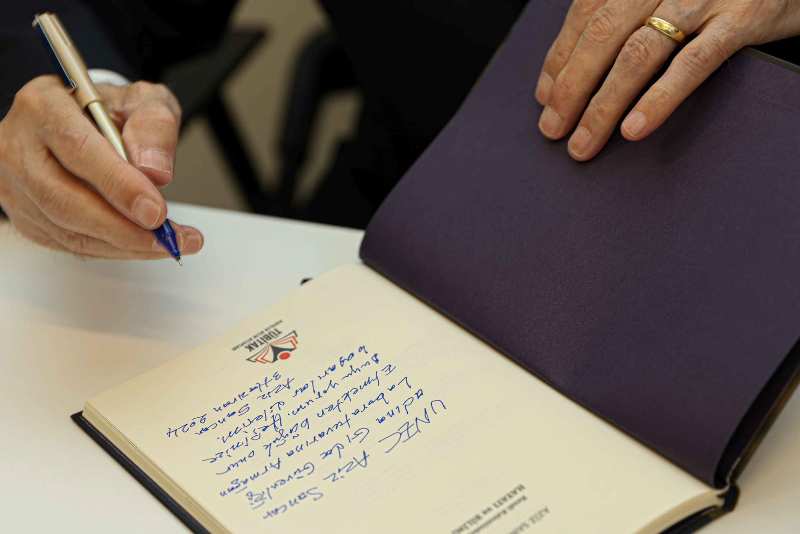 Prof. Aziz Sancar sualları cavablandırdıqdan sonra müəllifi olduğu “Aziz Sancarın kalemində Hayatı və Bilimi” adlı kitabını imzalayaraq, UNEC-ə hədiyyə edib.