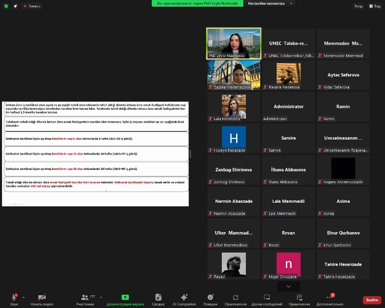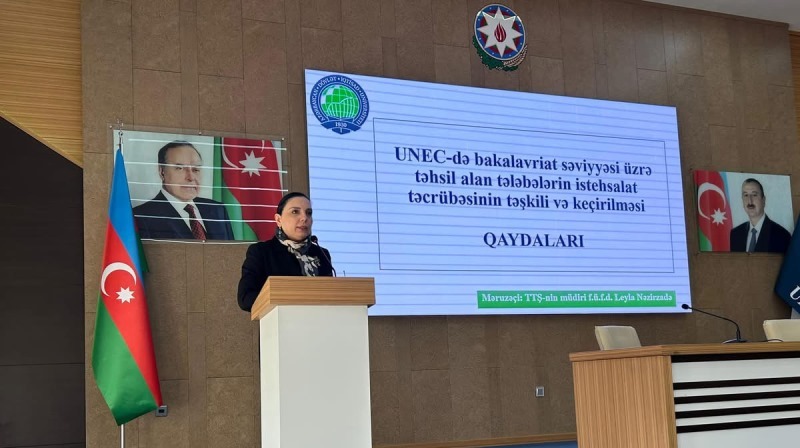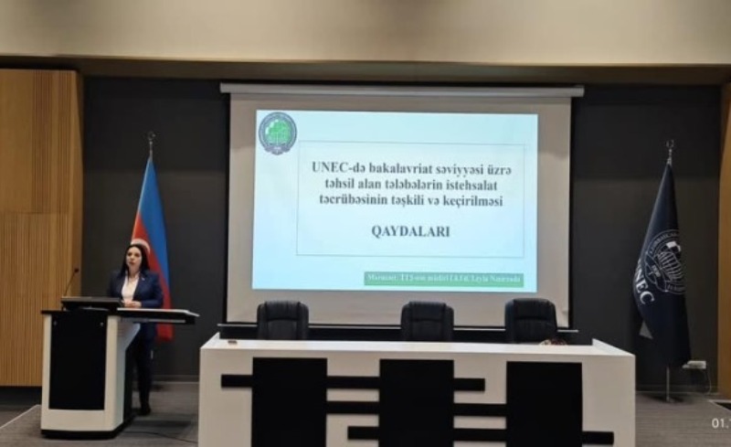 Təcrübənin təşkili şöbəsinin müdiri fəls.f.d Leyla Nəzirzadə sonuncu kurs tələbələrini istehsalat təcrübəsinə dair yeni qaydalarla tanış edib. Onlara təcrübə müddətində tələbələrin riayət etməli olduğu tələblər, hesabat hazırlama prosedurları, iş yerlərindəki vəzifə öhdəlikləri və mentor dəstəyi ilə bağlı məlumatlar təqdim edib.