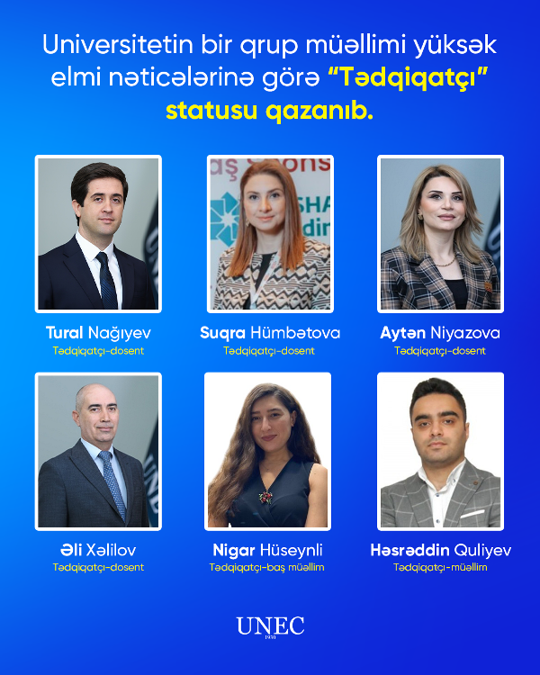 Universitetin bir qrup müəllimi yüksək elmi nəticələrinə görə “Tədqiqatçı” statusu qazanıb. Suqra Hümbətova, Tural Nağıyev, Aytən Niyazova və Əli Xəlilov “Tədqiqatçı-dosent”, Nigar Hüseynli “Tədqiqatçı-baş müəllim”, Həsrəddin Quliyev isə “Tədqiqatçı-müəllim” statusuna layiq görülüblər.