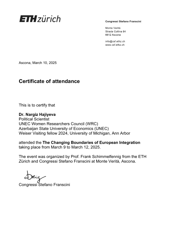 Azərbaycan Dövlət İqtisad Universitetinin (UNEC) Elmi fəaliyyətin təşkili şöbəsinin müdiri, UNEC Xanım Tədqiqatçılar Şurasının rəhbəri, siyasi alim Dr. Nərgiz Hacıyeva İsveçrə Konfederasiyasının nüfuzlu ali təhsil müəssisəsi “ETH Sürix” – Sürix Federal Texnologiya İnstitutunun professoru, Müqayisəli Siyasət beyin mərkəzinin direktoru, siyasi elmlər üzrə Frank Shimmenfennigin dəvətilə 09-12 mart tarixlərində İsveçrə konfederasiyasının Lokarno şəhərində keçirilən "The Changing Boundaries of European Integration" adlı beynəlxalq seminarda çıxış edib.