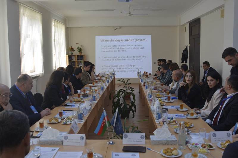 UNEC rektorunun müşaviri dosent Elşən Bağırzadə seminarda “Viskonsin İdeyası və Regional İnkişafda Universitetin Rolu” mövzusunda təqdimatla çıxış edib. E.Bağırzadə bu yanaşmanın regionların sosial və iqtisadi inkişafına necə töhfə verəcəyini izah edib, həmçinin yanaşmanın mahiyyəti və tətbiq perspektivləri barədə ətraflı məlumat verib.