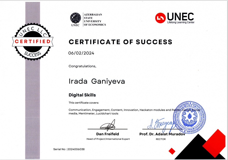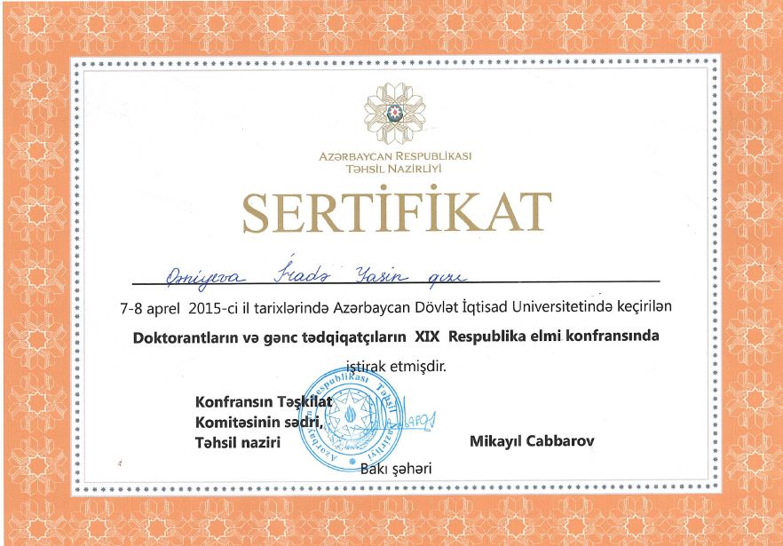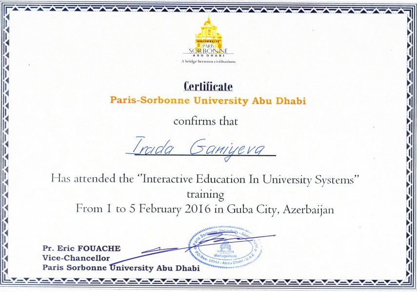 “Digital skills” və s. sahələr üzrə kurslarda, həmçinin, beynəlxalq konfranslarda verilmiş sertifikatlar, yerli və xarici jurnallarda nəşr olunmuş bir çox elmi məqalələr.