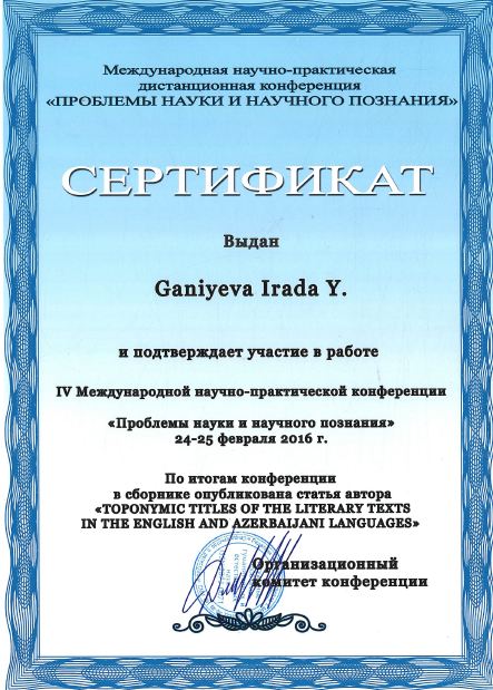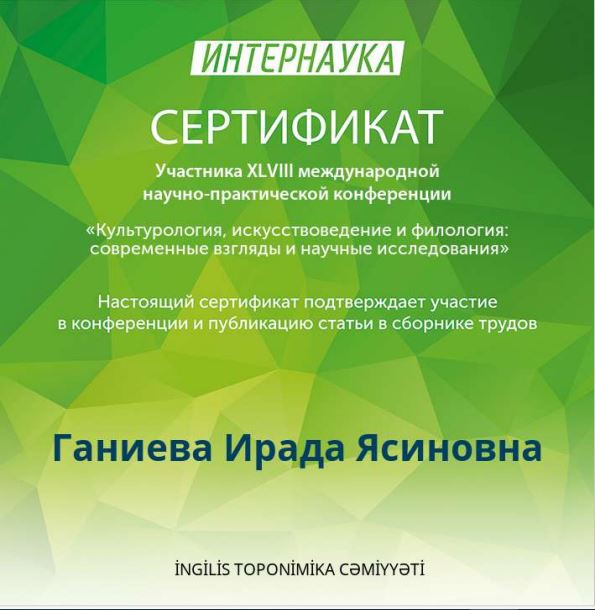Azərbaycan Respublikasının Prezidenti Yanında Ali Attestasiya Komissiyasının 04.10.23-cü il tarixli qərarı ilə İradə Yasin qızı Qəniyevaya filologiya elmləri üzrə fəlsəfə doktoru elmi dərəcəsi verilmişdir.