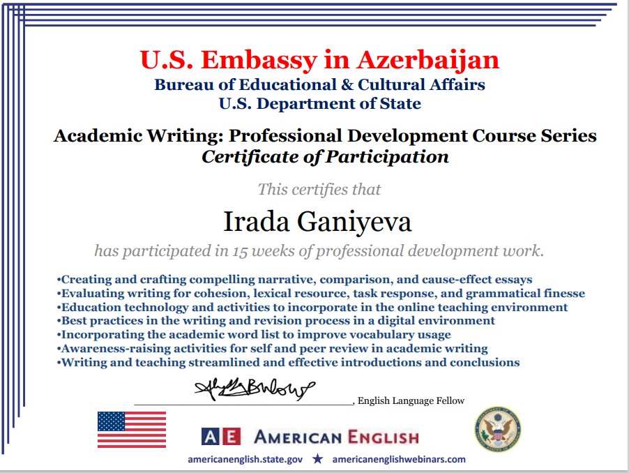 İngilis və amerikalı təlimçilərin universitet müəllimləri üçün təşkil etdiyi ixtisasartırma və təkmilləşdirmə kurslarında aktiv iştirak edərək sertifikatlar almışdır.